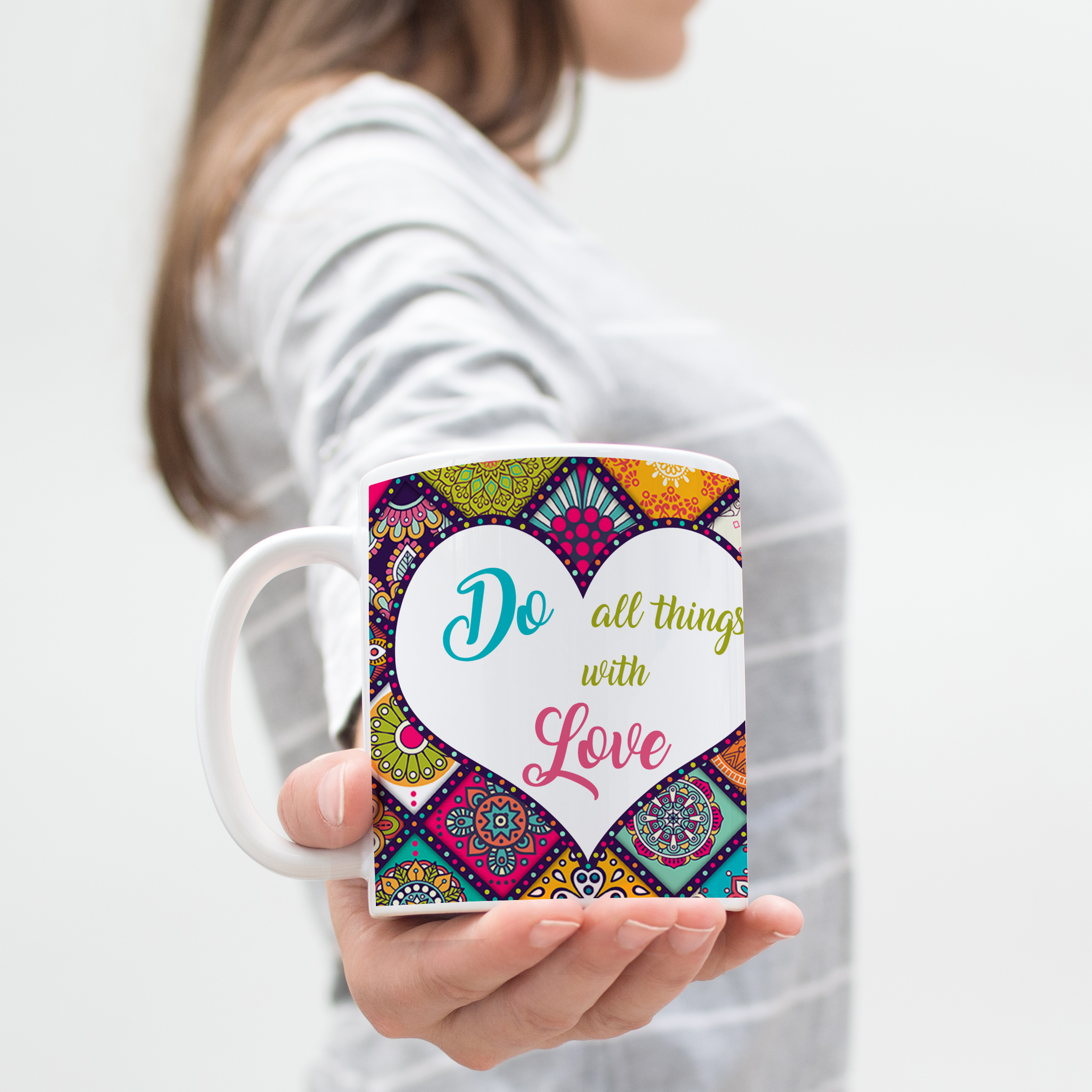 Alege cadoul potrivit pentru persoana draga, cana cu mesaj spiritual – Do all things with love / Let your heart shine