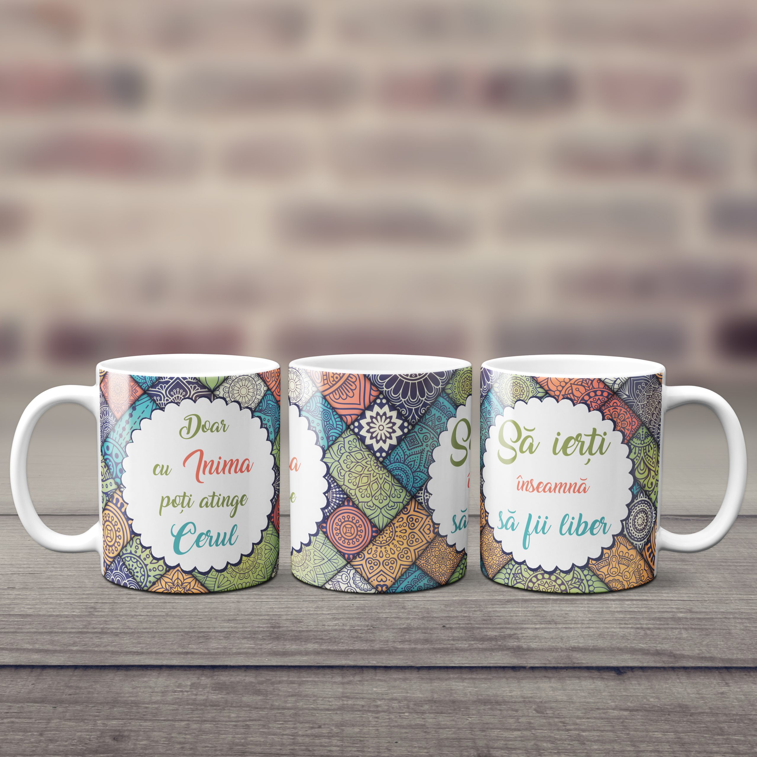 Alege cadoul potrivit pentru persoana draga, cana cu mesaj spiritual – Doar cu Inima poti atinge Cerul / Sa ierti inseamna sa fii liber