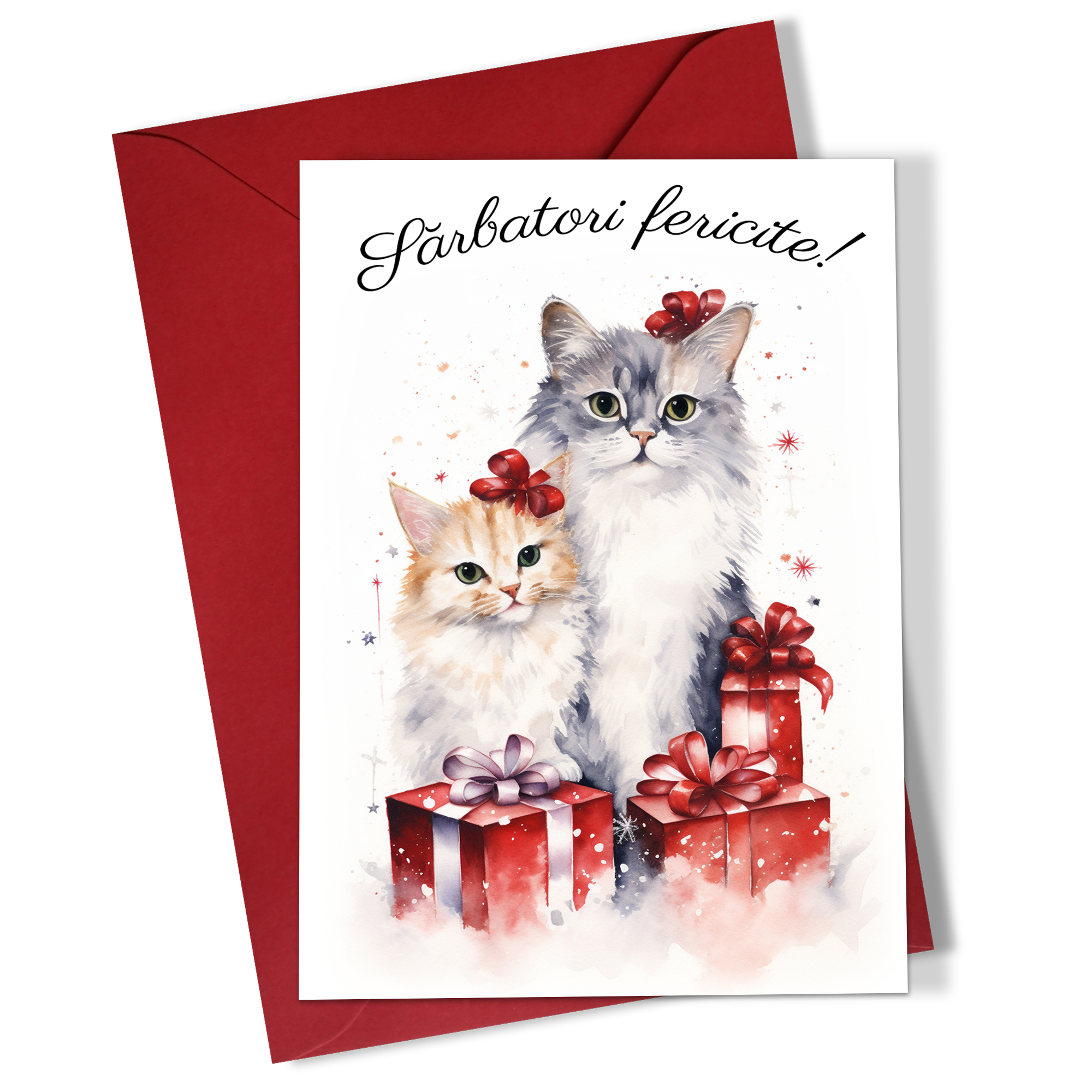 Set 5 felicitari in engleza de Craciun 10x15 cm cu plic auriu inclus - Pisici de Craciun - FC-111